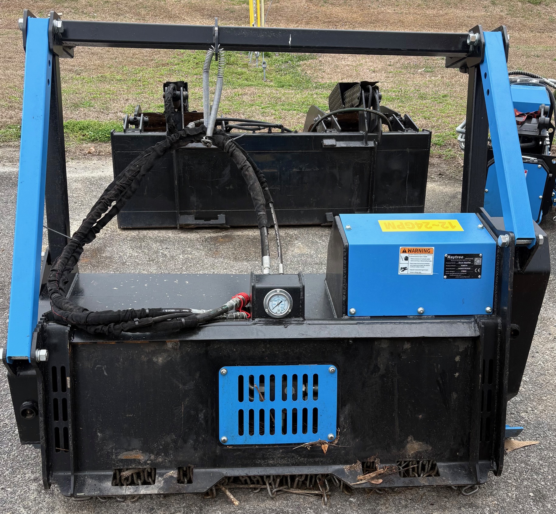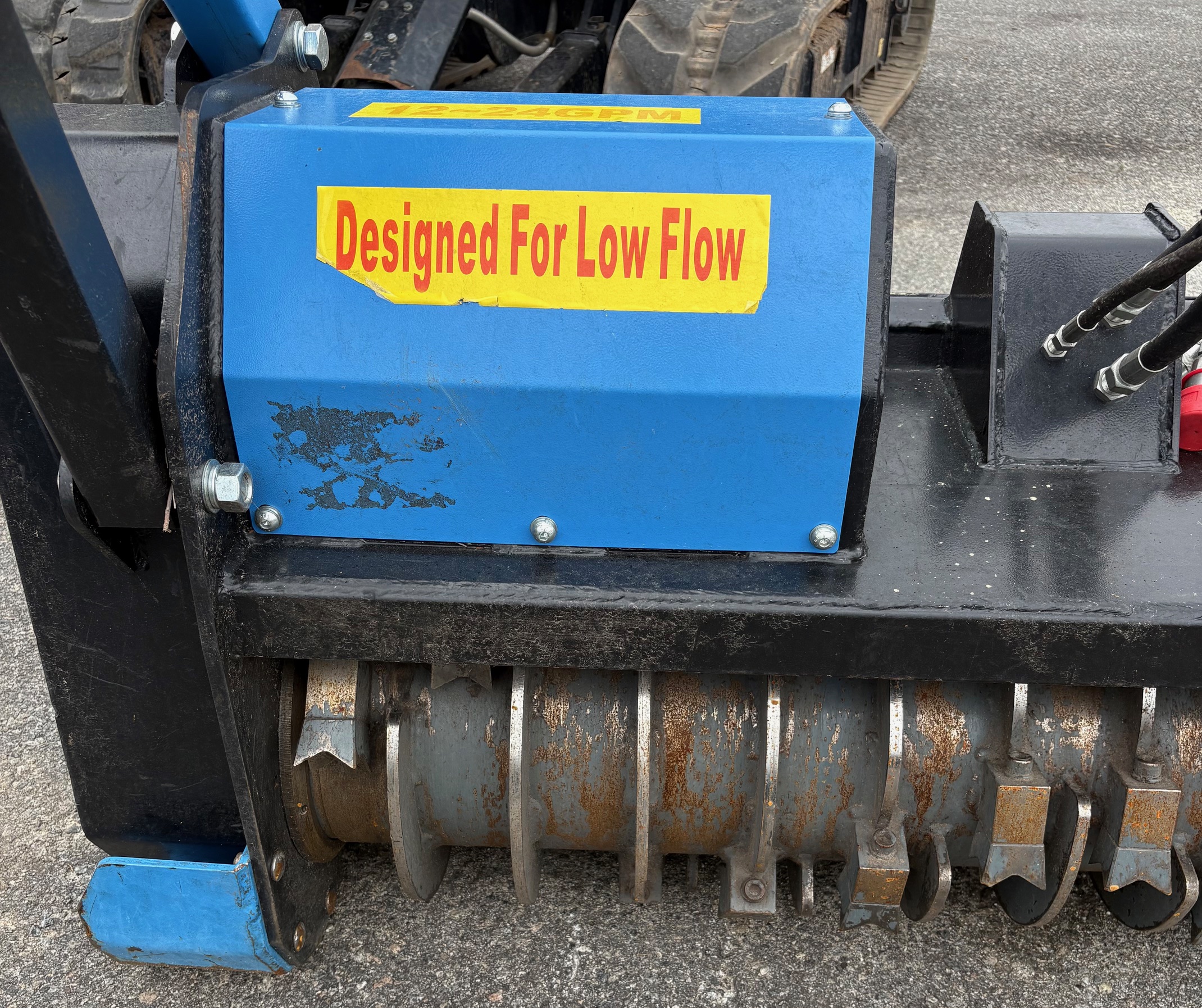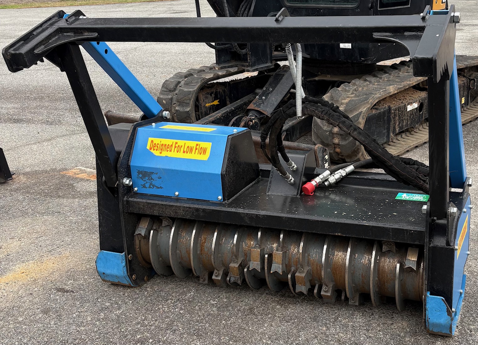 The Raytree RMBD50 is a 50-inch drum mulcher attachment designed specifically for low-flow skid steer loaders, typically operating between 11 and 24 GPM. It is marketed for clearing brush and trees up to 6–8 inches in diameter.