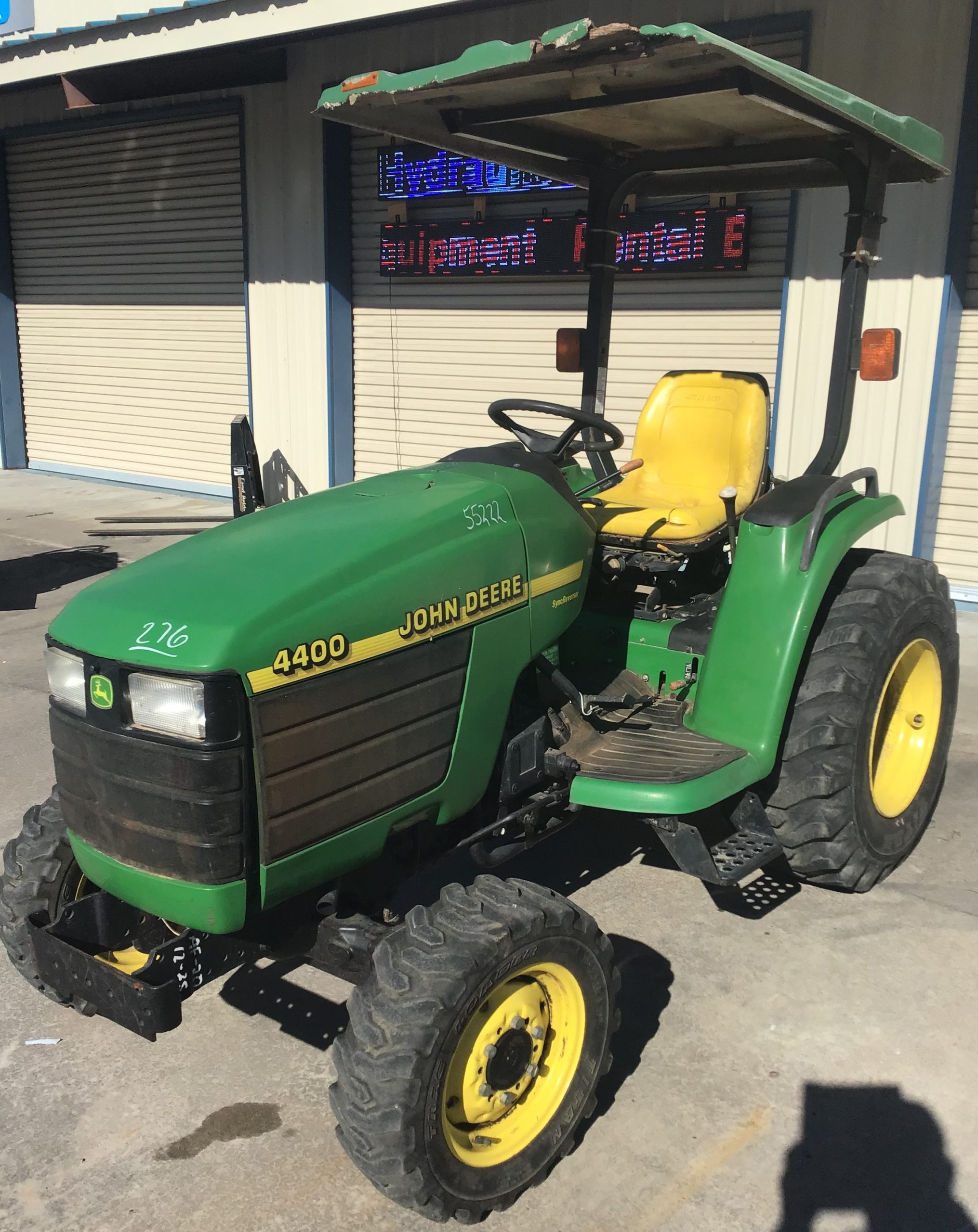 The 4400 is designed for a range of tasks, from loader work to bush hogging. It can be fitted with attachments such as the John Deere 420 or 430 loaders, John Deere 47 or 48 backhoes, and 60-inch or 72-inch mid-mount mower decks. 4X4. 862Hrs