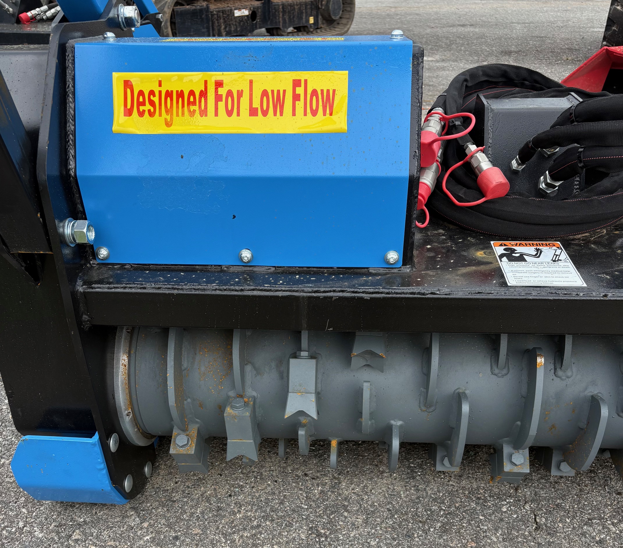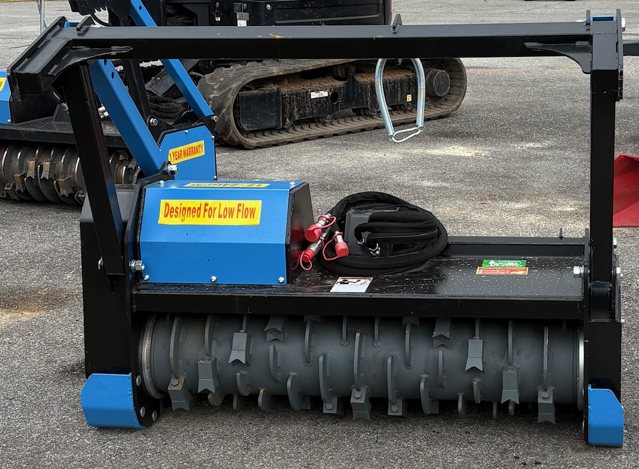 The Raytree RMBD50 is a 50-inch drum mulcher attachment designed specifically for low-flow skid steer loaders, typically operating between 11 and 24 GPM. It is marketed as a for clearing brush and trees up to 6–8 inches in diameter.