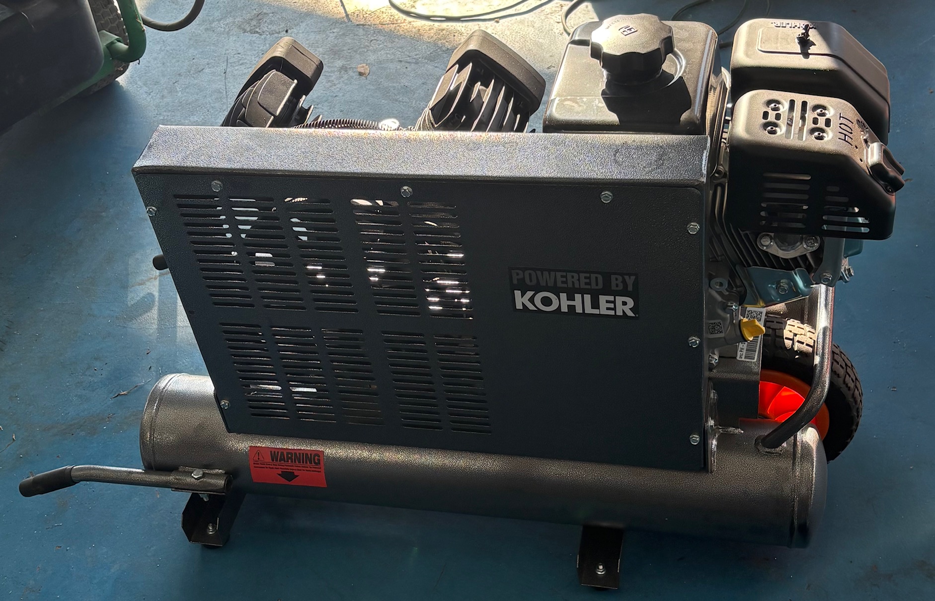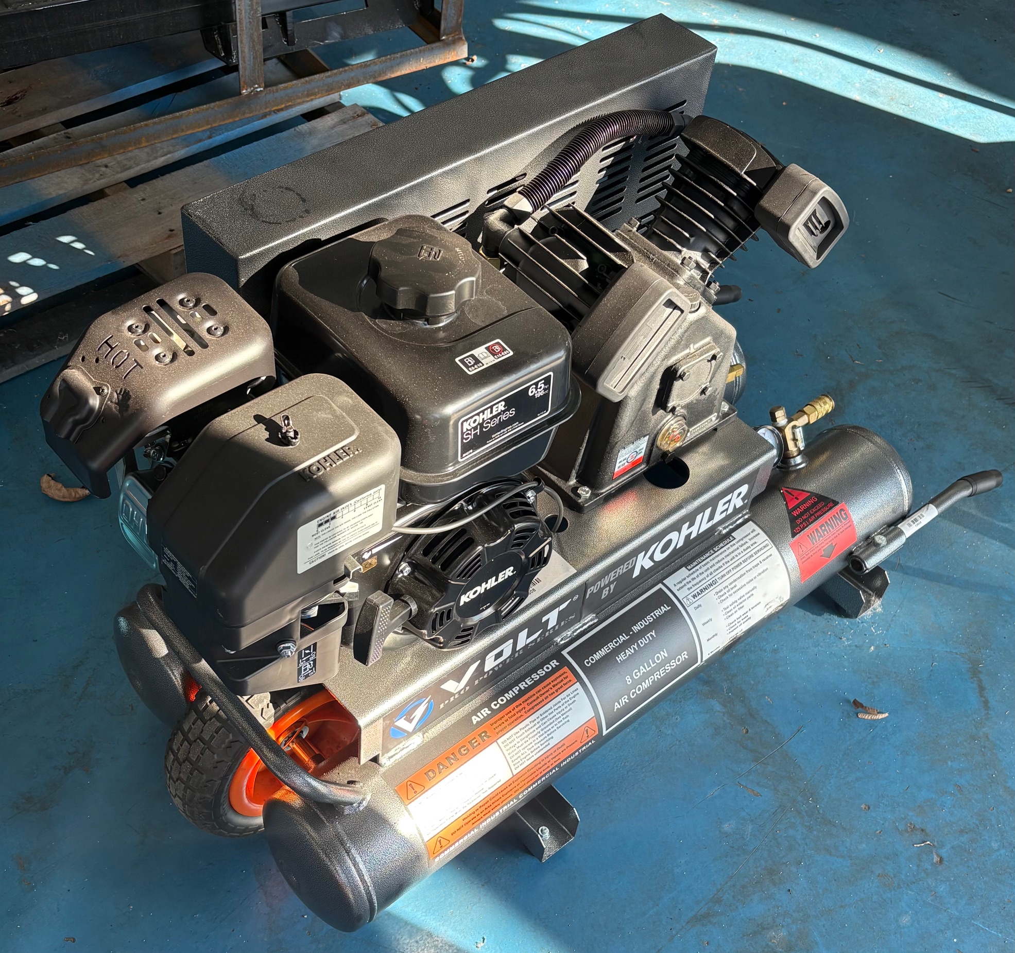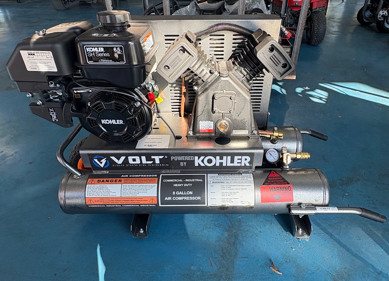 The Volt powered by Kohler twin tank air compressor, model VK2TA, is a portable, gas-powered compressor designed for heavy-duty job site use. It features an 8-gallon twin tank and a durable cast iron pump for efficient, reliable performance. Includes a low oil shutdown feature and a pressure-regulated tank for safe operation. This unit is powered by a Kohler CH270 Gasoline Engine (7.0 HP, 208cc). Air Delivery: 12 CFM @ 100 PSI. Max Pressure: The unit runs fast to fill tanks, then idles down, kicking on at 125 PSI. Fuel Capacity: 1 Gallon Weight: 160 Lbs. Dimensions: 44″ L x 19.5″ W x 25″ H.